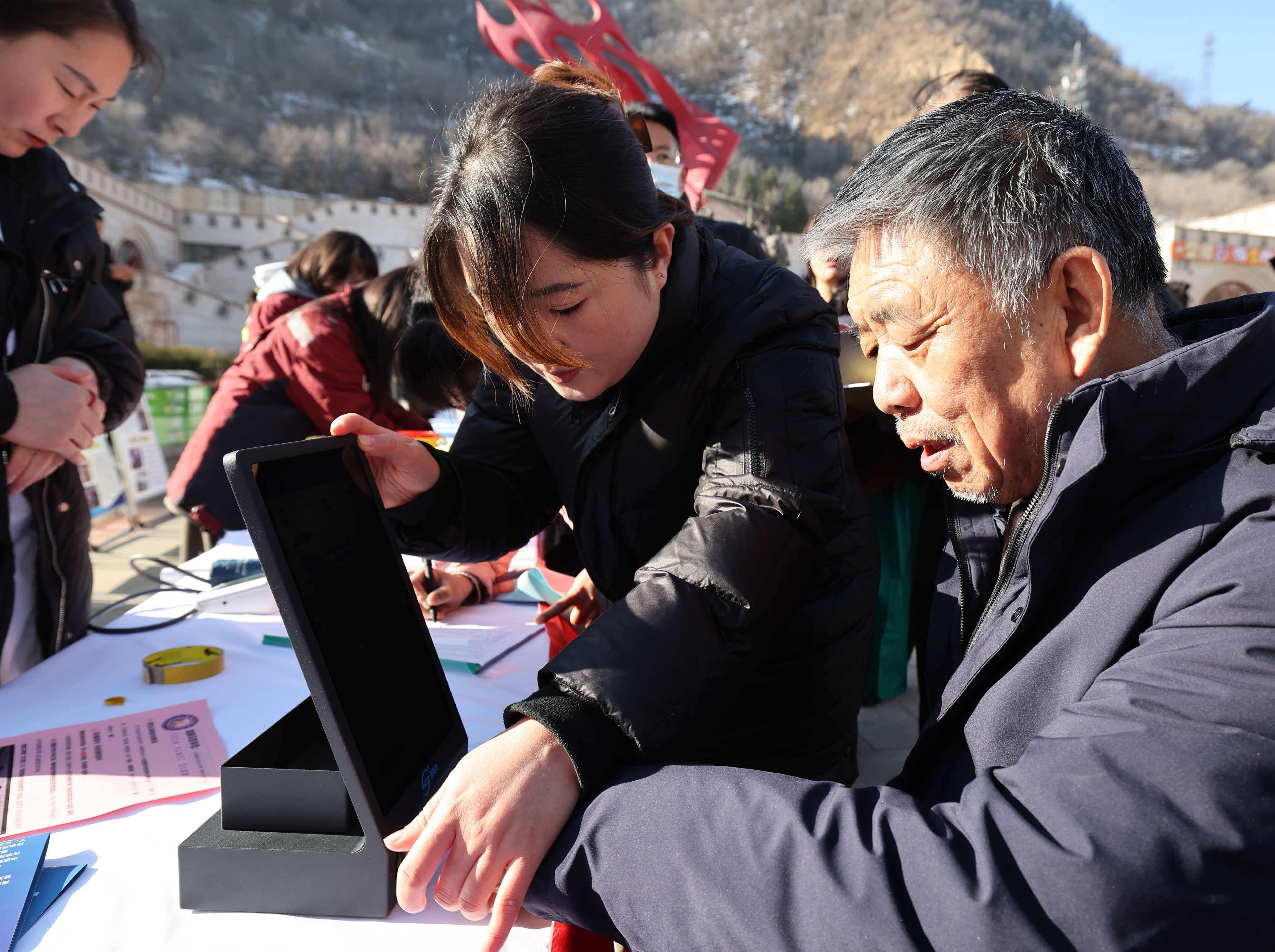 “您看这几项指标的数值,红色表示偏高,蓝色表示偏低,之后还可以到医院进一步检查。”医护人员为体检的群众解释报告里的内容,并提醒大家注意日常健康。