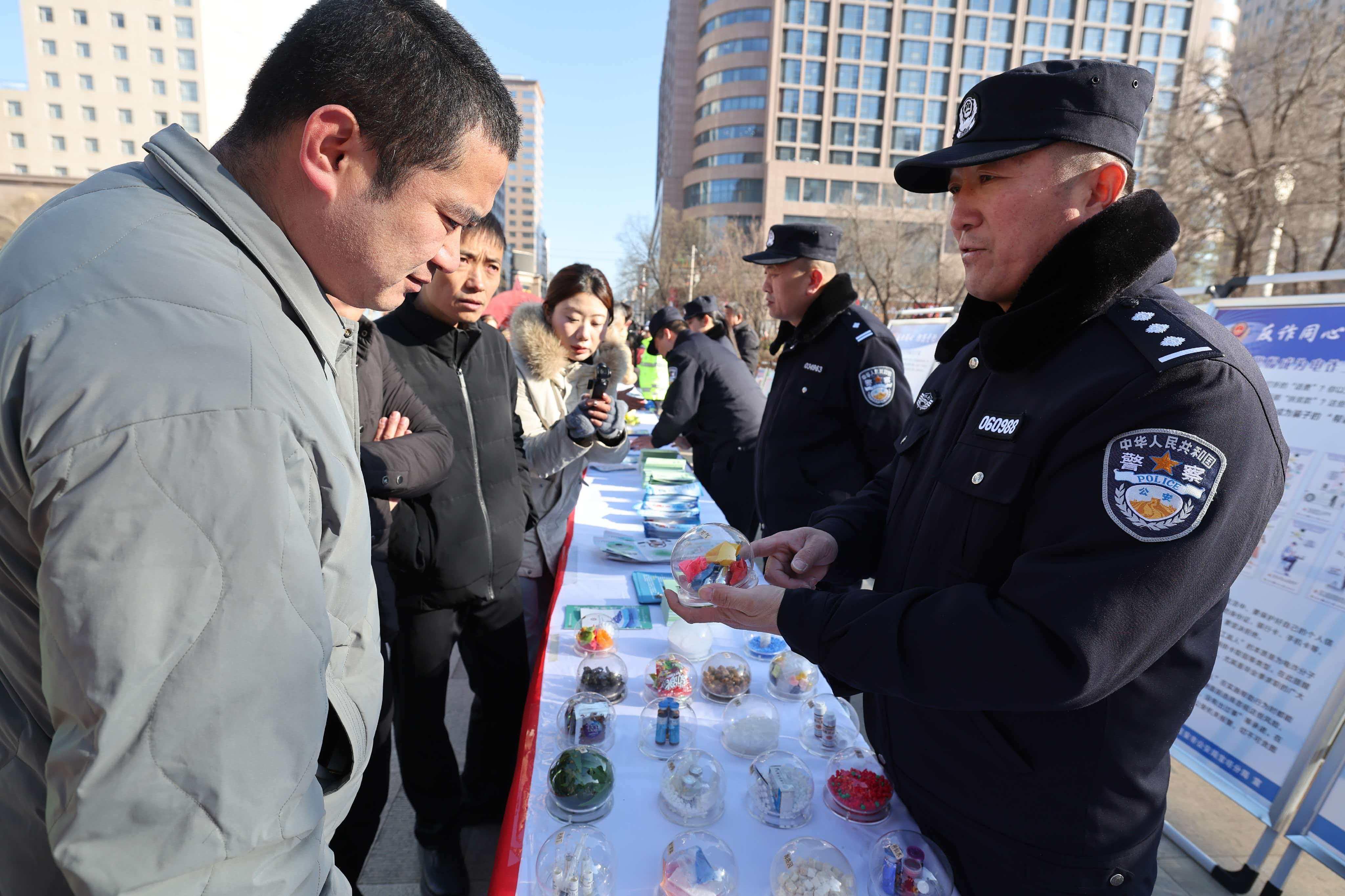 在延安市公安局宝塔分局服务展位前,展示的多种常见毒品及仿真样品吸引了许多人围观。民警结合实物,向群众详细讲解毒品的种类、危害及识别方法,尤其重点警示新型毒品的隐蔽性风险。