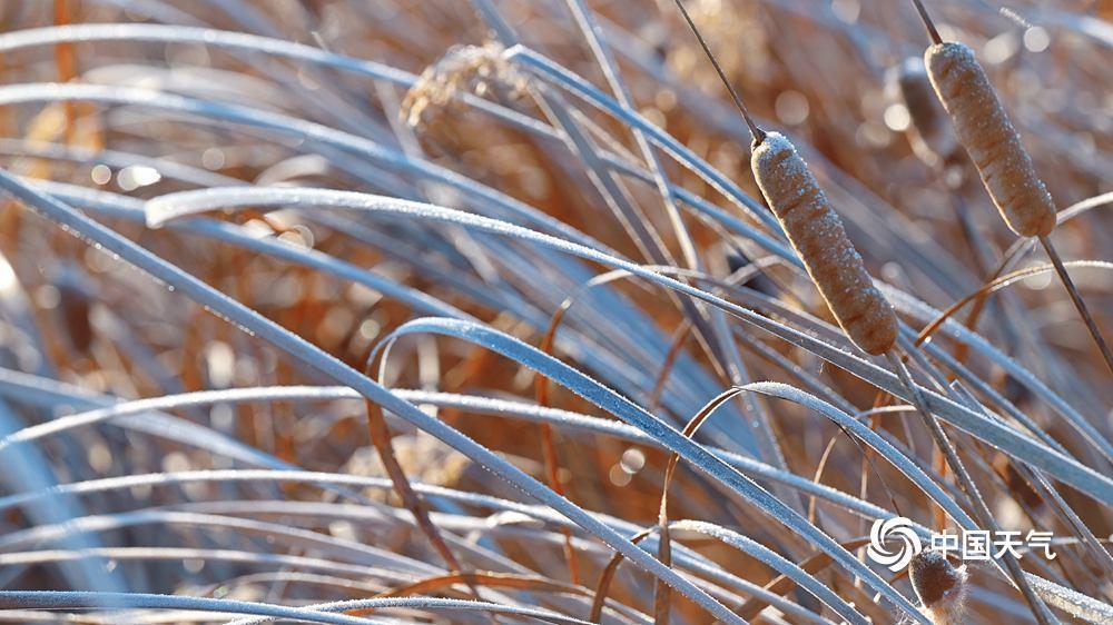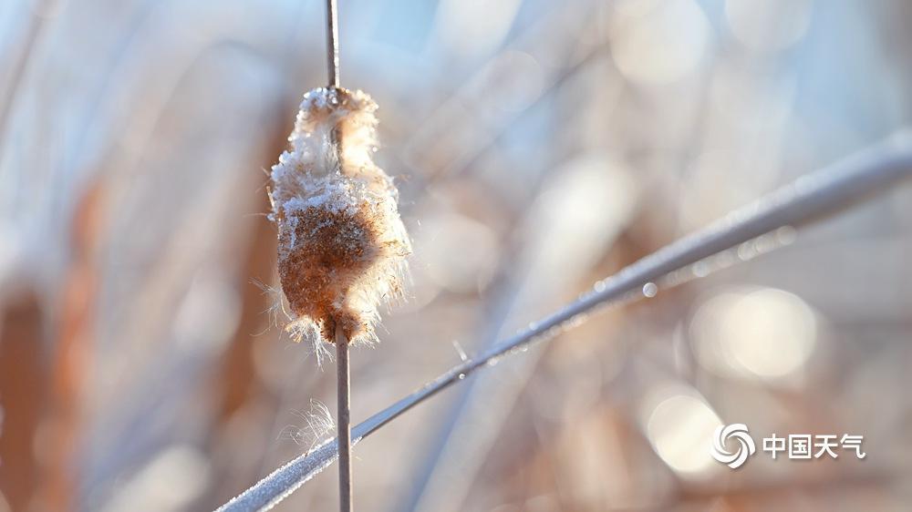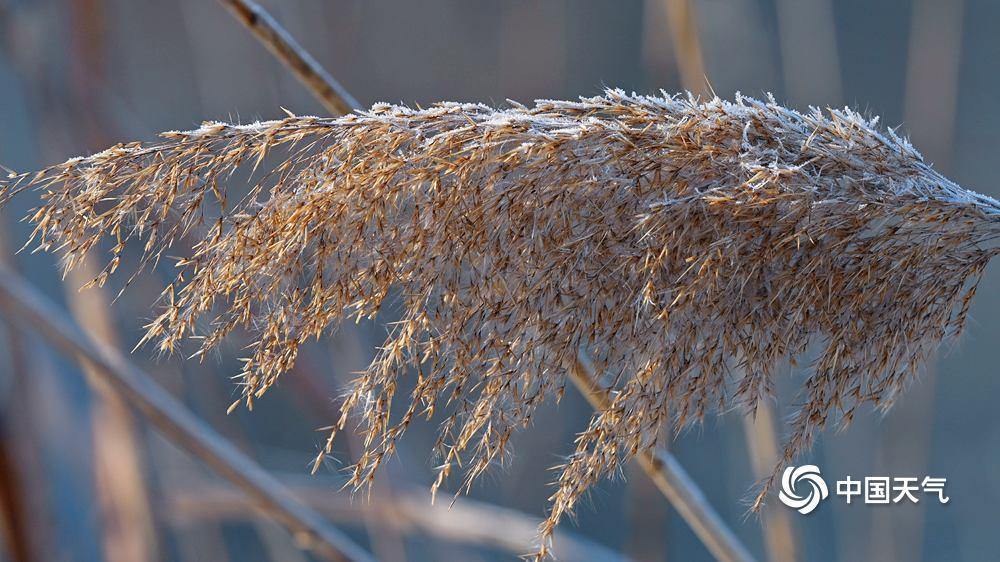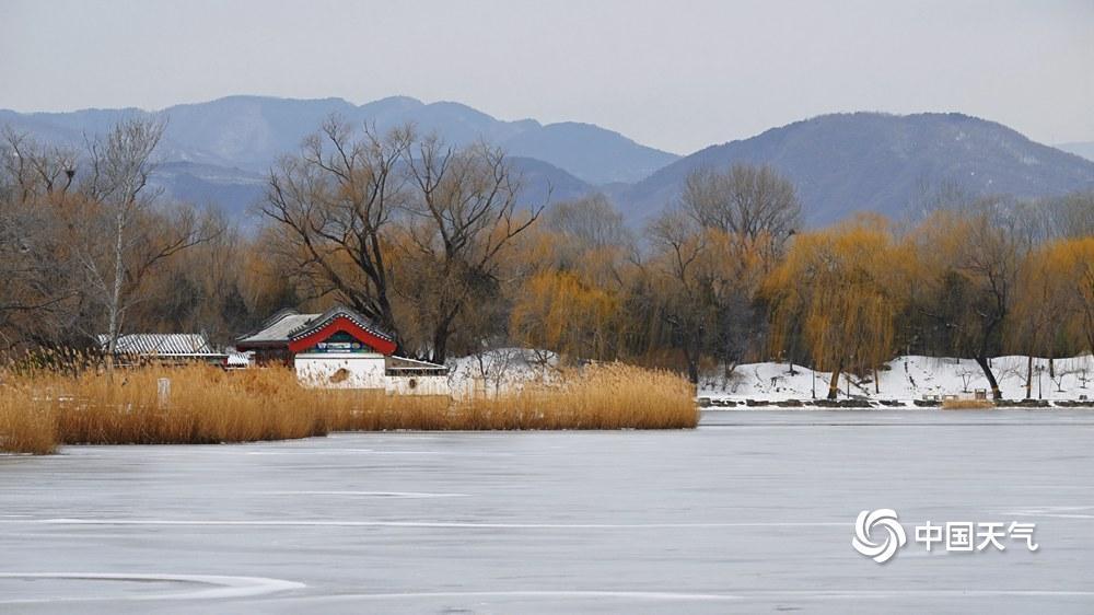 12月17日,北京圆明园,芦苇上的白霜与湖面及地面上未融的积雪相互映衬,远处的西山清晰可见,共同勾勒出冬日风光。(来源:中国天气网)