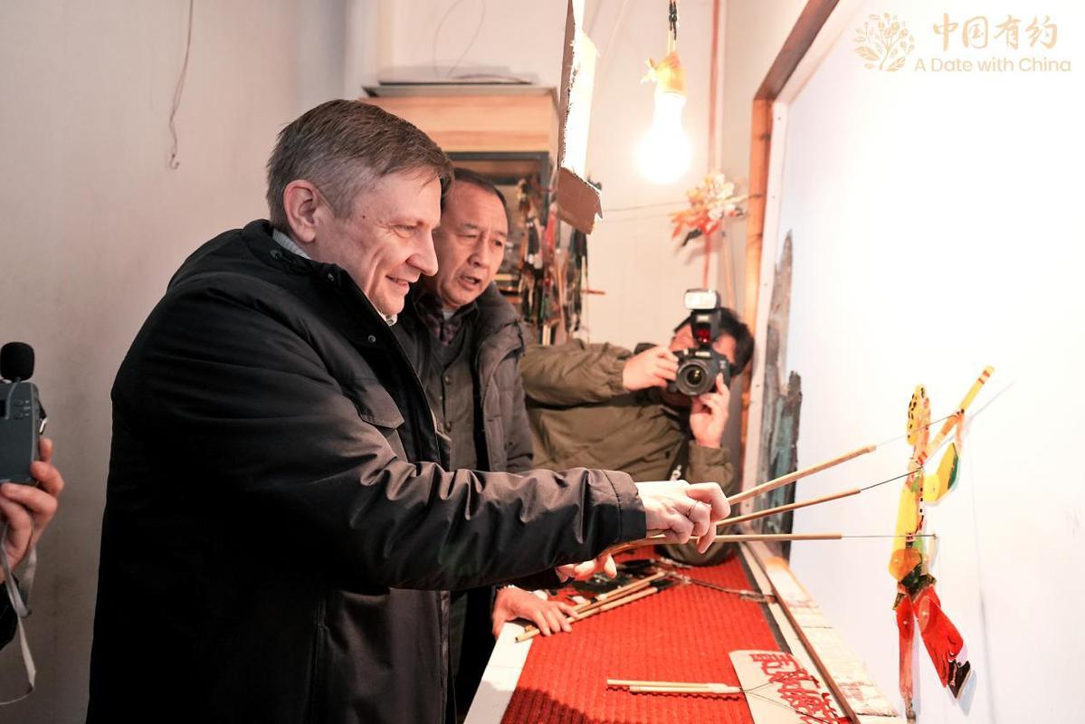 外国朋友体验皮影戏表演。