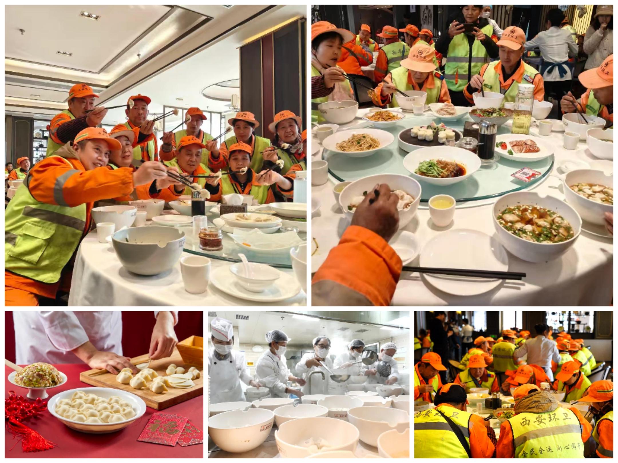 上午10时许,环卫工人们被陆续邀请进入西安钟鼓楼广场德发长饺子馆。伴随着服务员的热情吆喝,一盘盘皮薄馅大、热气腾腾的饺子被端上桌。席间,非遗德发长饺子制作技艺代表性传承人现场展示和面、制馅、捏制等非遗工序,让大家近距离感受中华饮食文化的精髓。