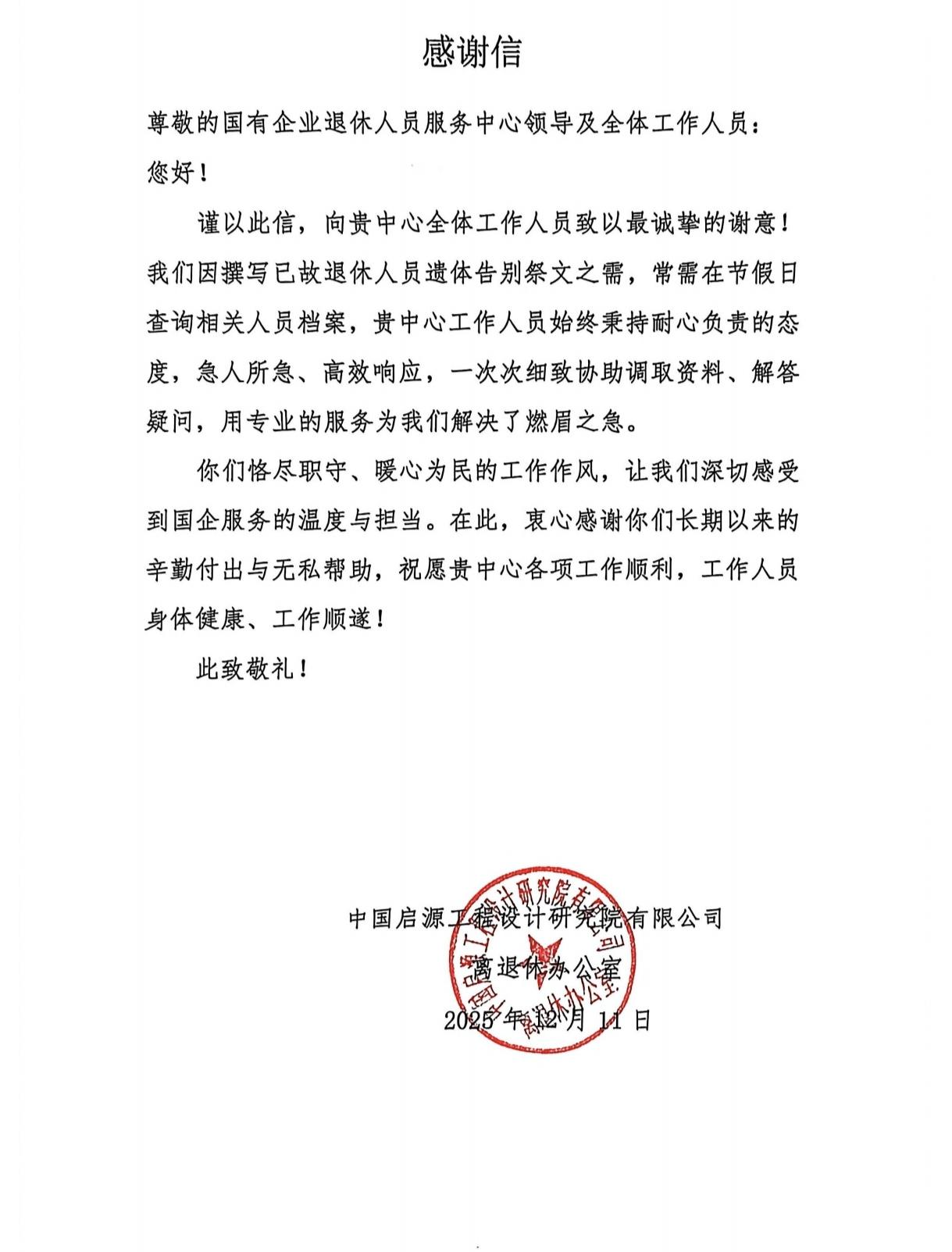 急人所急效率高,专业服务获赞誉。中国启源工程设计研究院有限公司离退休办公室也特意发来感谢信。因撰写已故退休人员遗体告别祭文,常需在节假日紧急查询档案。西安市国有企业退休人员服务中心工作人员始终秉持耐心负责的态度,急人所急、高效响应,一次次细致协助调取资料、解答疑问,用专业服务解决了企业燃眉之急,让企业深切感受到国企服务的温度与担当。