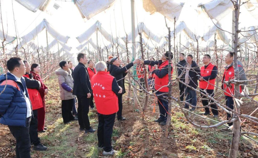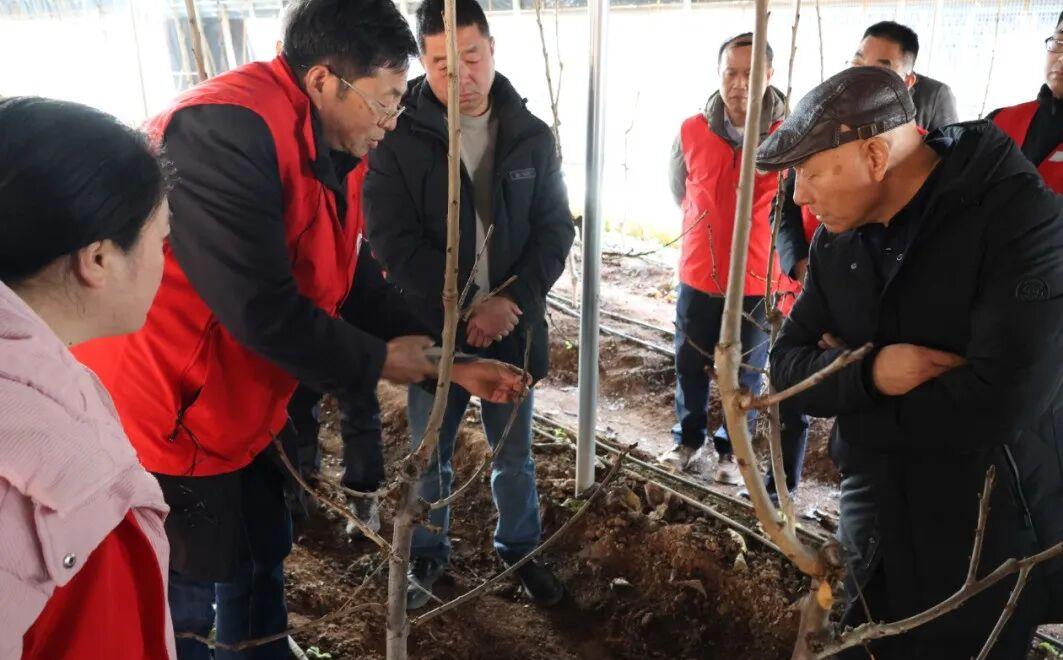 座谈会结束后,老干部志愿者前往樱桃大棚和露天樱桃园,开展田间指导。“你看这棵树,枝条过密导致通风透光不足,会直接影响果实生长!”蔡宇良作为樱桃种植领域的资深专家,站在果树下一边示范“抹芽刻芽”修剪动作,一边细致讲解双芽剪和留桩修剪的技术要点。张创新提出了“三看三问”的修剪原则,省农学会副会长兼秘书长张旭峰则向大家解答了树干留白的好处和方法。针对农户反映的病虫害问题,专家们当场给出各种切实有效的解决方案。农技人员和农户们都围在周边录制视频记录要点,生怕错过专家讲解的细节。“专家讲的都是实打实能用得上的东西,之前困扰许久的问题,今天终于有了解决办法!”蓝田县华胥实业有限公司负责人姜勃说,“有老专家们的支持,我们发展樱桃产业更有底气了!”