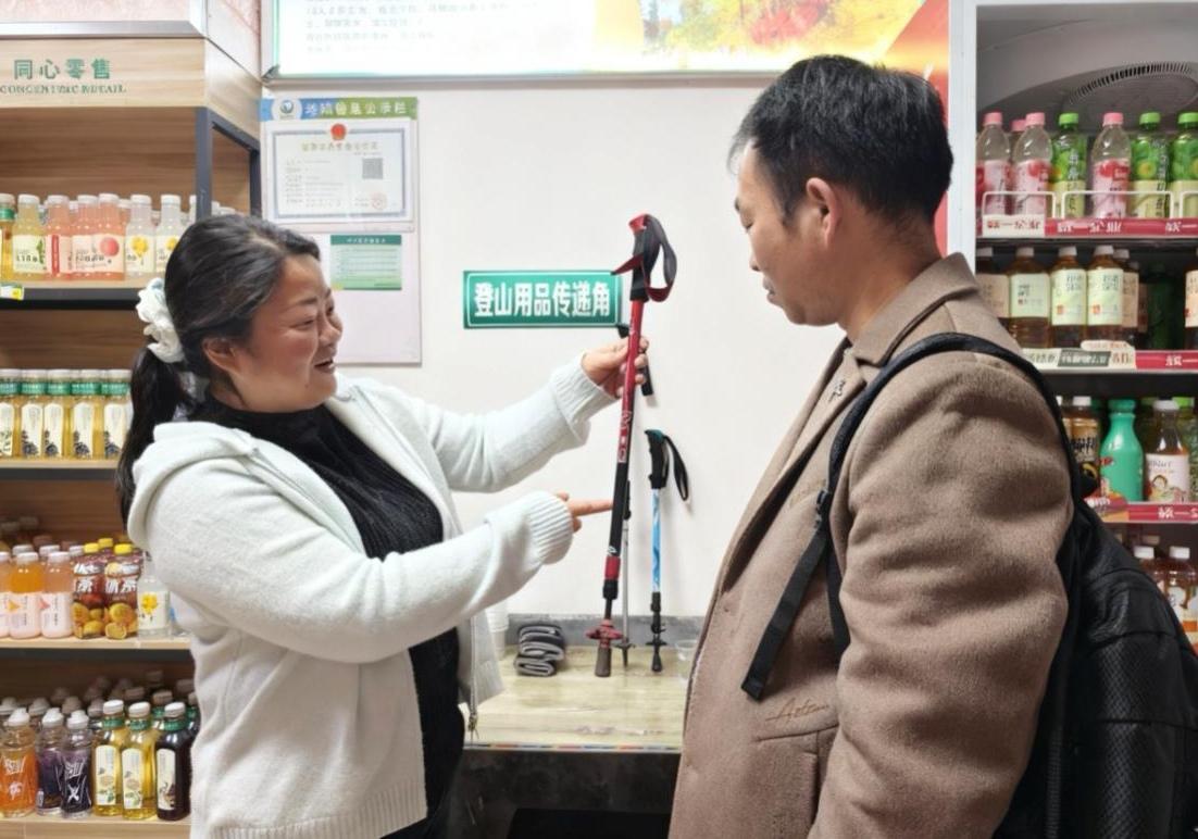 “店好看了,但生意要更红火才行!”李莉找到纪宏梅寻求建议。纪宏梅提出“旅游+零售”策略。引进木瓜、果脯等特产,设置文旅展示灯牌标注景区和银杏树观赏点,提供免费热水、手机充电等便民服务。李莉还设立“登山用品传递角”,收集游客丢弃的登山杖、护膝等装备供后续游客免费使用。