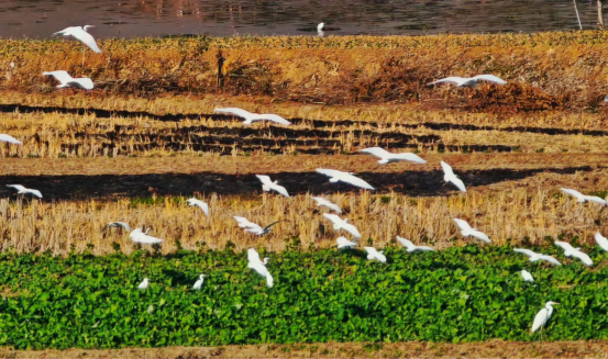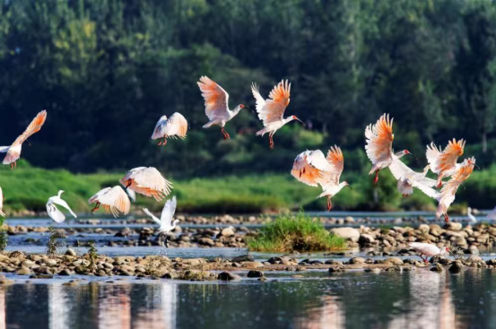 湑水河畔,一群群朱鹮或在河滩觅食,或在白杨树上栖息,赤色羽翼在阳光下熠熠生辉,远处是广袤的水田与葱郁林木,“漠漠水田飞白鹭,阴阴夏木啭黄鹂”的诗意在此重现。