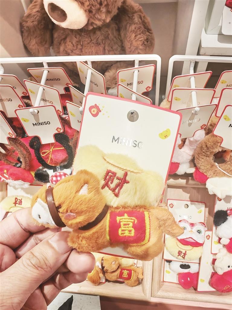 12月18日,龙首印象城名创优品店内,“马年新品专区”中各种立体毛绒小马造型的挂饰格外吸睛。一旁的小马造型发卡,褐色的马披着红色的外衣,背上还驮着写有“财”字的元宝,与衣服上的“富”字共同构成了美好的寓意。
