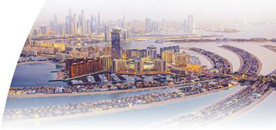 迪拜朱美拉棕榈岛是世界上最大的填海造地项目之一,外形为棕榈树形状,由“主干”和17条“枝干”组成,外加一个圆环挡水岛。中建中东公司参与建设了分布在棕榈岛11条“枝干”上的818套别墅。图为朱美拉棕榈岛夜景。