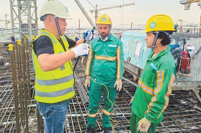 “鲁班工匠计划”是中国建筑推出的一项属地员工培训计划。中建中东公司在承接各项工程时,通过师带徒和现场教学方式,开展技能实操、安全生产、理论知识等各项培训。图为中方员工(左一)在施工现场进行教学。