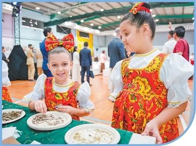 迪拜中国学校是中国政府在海外开办的第一所中国学制全日制学校。中建中东公司积极参与学校的筹备建设和运营工作。图为今年8月,在迪拜中国学校开学典礼上,两名当地小学生正在体验中国文化。