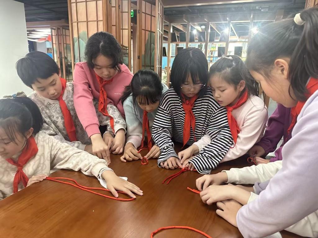 理论学习之后,是非遗代表性传承人的零距离互动环节,将整场活动推向了高潮。陕西省市级非遗逢灯结绳技艺代表性传承人李家欢老师、王骁远老师亲临现场,亲自传授技艺。彩绳在老师们指尖翻飞起舞,一个个精美的结饰瞬间成型,令队员们惊叹不已。大家聚精会神地跟着学习基本手法,时而认真记录笔记,时而主动举手提问,甚至大胆分享自己的创作思路。通过亲手实践,队员们深刻体会到了“匠心”二字的含义,这份体验深深烙印在了每个孩子的心中。
