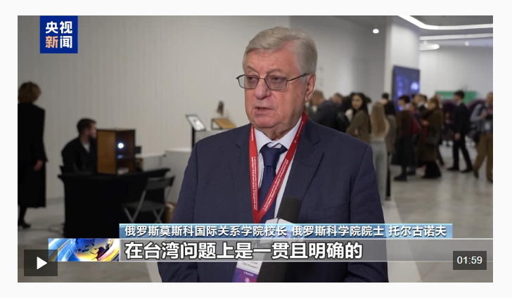 俄罗斯莫斯科国际关系学院校长 俄罗斯科学院院士 托尔古诺夫:俄罗斯和俄罗斯外交的立场在台湾问题上是一贯且明确的,台湾是中华人民共和国的组成部分。围绕此议题的任何操弄,我认为不仅完全不合理而且极其危险。当前局势下,军事化是对整个区域安全都造成极大危险的因素,尤其当这种军事化还与台湾周边的局势相关联。