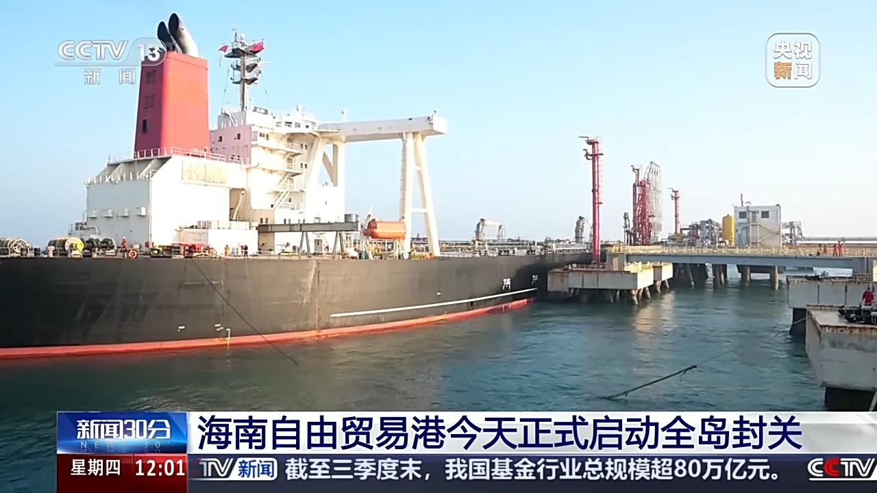 总台央视记者 孙艳:这里是海南自贸港“一线”放开的主通道洋浦港,我身后一艘搭载着17.9万吨石化原辅料的货船正缓缓靠港,这也是海南自贸港封关运作后的第一批“零关税”进口产品,海关快速验行,节省通关时间近4小时。