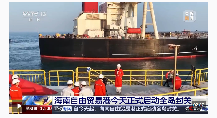 海口海关所属洋浦海关综合业务处科长 艾韬:为保障全岛封关后第一批货物快速通关,我们实施高频调度,提前摸排进口计划,研究“一货一策”服务机制,确保全岛封关平稳有序。