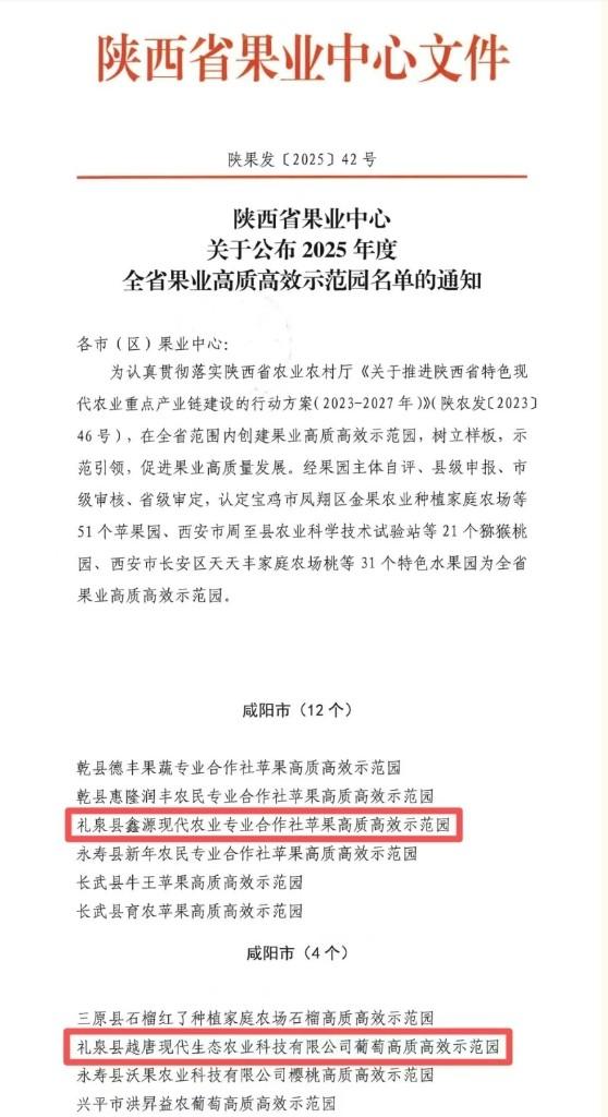 三秦都市报-三秦网讯(王晨宇)近日,省果业中心公布2025年全省果业高质高效示范园名单,咸阳市礼泉县鑫源现代农业专业合作社苹果高质高效示范园、礼泉县越唐现代生态农业科技有限公司葡萄高质高效示范园成功入选。这一成果,标志着该县果业高质量发展再添新动能。