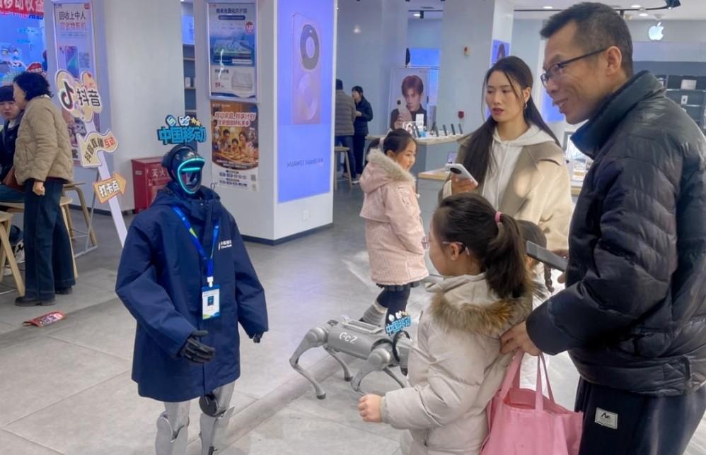 一踏入厅店,迎接市民的不是排队的长龙,而是两位热情洋溢的人形机器人“小移”和“小天”。它们用可爱的外表和流畅的语音交互,瞬间拉近了与市民的距离,仿佛从科幻电影里走来的伙伴,让整个空间充满了亲切的未来感。