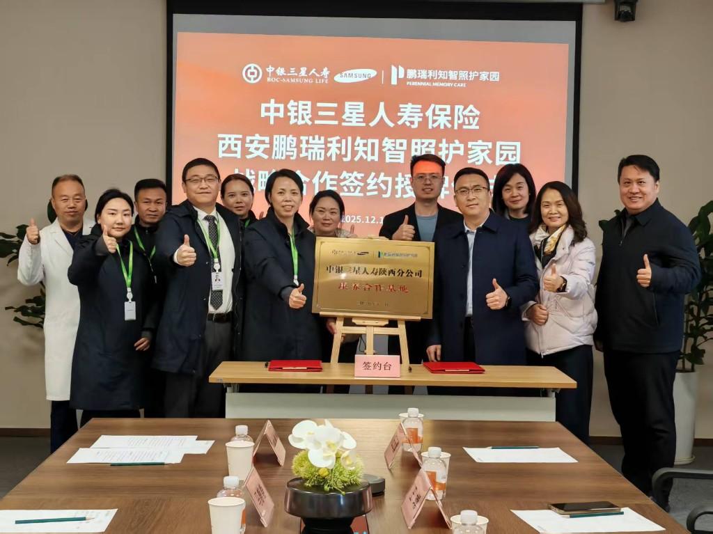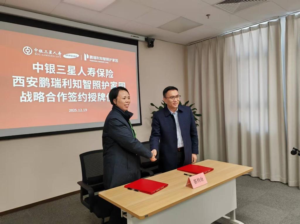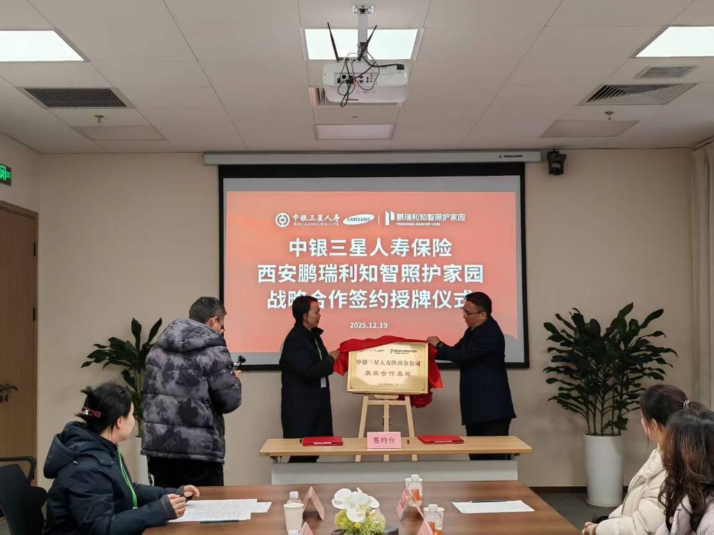 三秦都市报-三秦网讯(闫娜)为积极响应国家健康养老金融政策号召,加快康养生态建设步伐,推动养老业务创新发展,12月19日,中银三星人寿陕西分公司与西安鹏瑞利知智照护家园在周至县楼观生态文化旅游度假区隆重举行合作签约授牌仪式。中银三星人寿陕西分公司党总支书记李洪德,副总经理王靖,总经理助理安硕,西安鹏瑞利知智照护家园宋祥英院长、销售部主管李磊、康复科负责人崔占军等共同见证这一重要时刻。此次签约授牌仪式,标志着中银三星人寿的服务迈出了从“传统风险保障”向“综合解决方案”升级的关键一步。