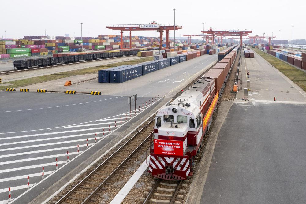 2025年12月5日拍摄的上海铁路芦潮港集装箱中心站(无人机照片)。当日上午,一趟载有太阳能光伏组件、汽车零配件等货物的海铁联运班列缓缓从上海芦潮港集装箱中心站开出,上海海铁联运年度业务量首次跨越百万标箱大关。新华社记者 王翔 摄