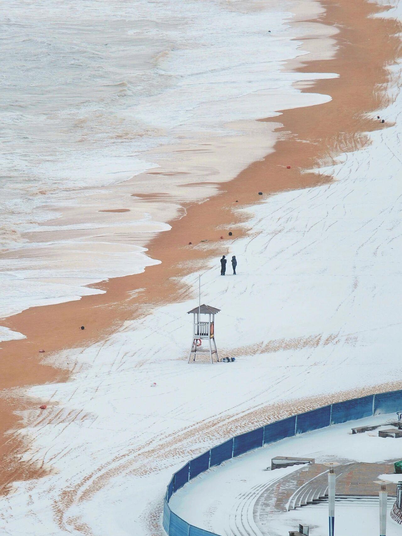 雪沙滩:海水退潮时刚好遇上一场大雪,厚厚的积雪覆盖在沙滩上;涨潮后,由于海水温度偏低,积雪遇水不会迅速融化,海水裹挟大量沙子覆盖在积雪之上,最终形成“下层沙-中层雪-上层沙”的雪沙滩。(来源:中国国家地理)