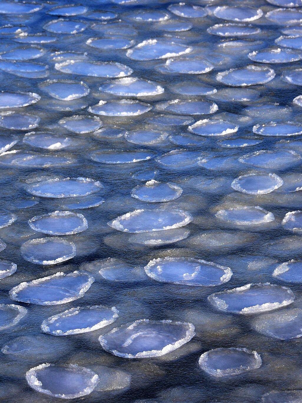 冰馕:在湖水波浪的作用下,湖面零散的冰块漂浮、旋转,体积逐渐增加,形成一个中间薄、周边厚的馕状冰体。(来源:中国国家地理)