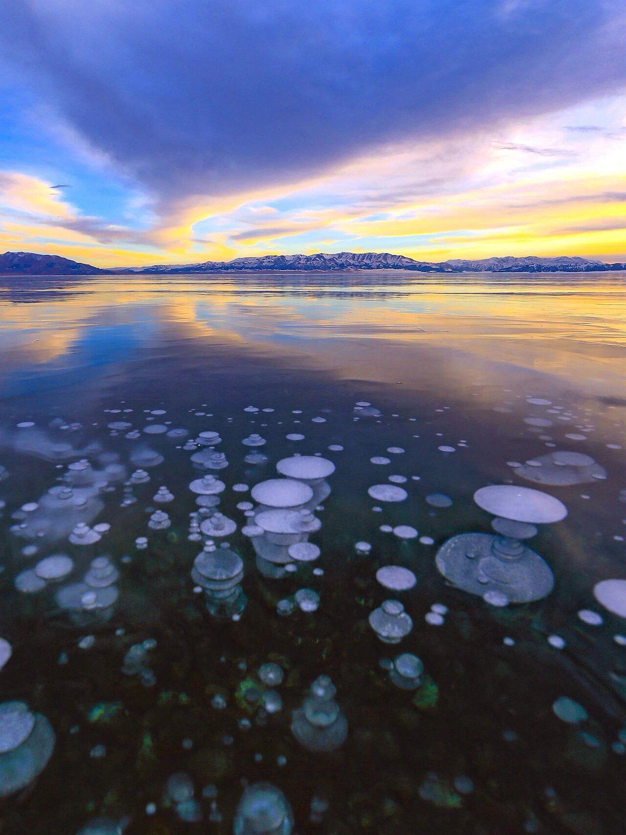冰泡:湖底生长着水草和藻类,其死亡后腐烂分解出大量的沼气。而沼气中不溶于水的甲烷不断朝湖面涌去,当湖水开始结冰,甲烷无处可逃,就会被“困”在冰层之中,形成一个个冰泡。(来源:中国国家地理)