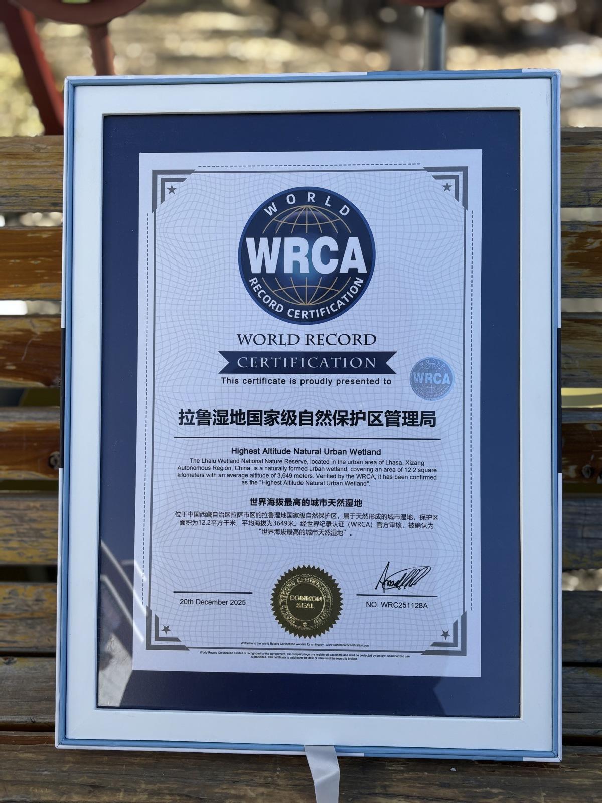 The Lhalu Wetland National Nature Reserve in Lhasa, Xizang autonomous region, has officially been recognized by the World Record Certification Agency (WRCA) as the world's highest-altitude urban natural wetland, authorities announced on Saturday in Lhasa.