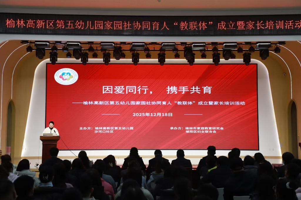 三秦都市报-三秦网讯(记者 韩晓妮)12月18日下午,榆林高新区第五幼儿园家园社协同育人“教联体”正式成立,旨在深化家园社协同育人成效,构建全方位、立体化育人新格局。榆阳区关工委、榆林市家庭教育研究会、沙河口社区等单位相关负责人,法治副校长、消防代表、家庭教育讲师、家委代表及家长等230余人参与活动,活动由该园张春利园长主持。