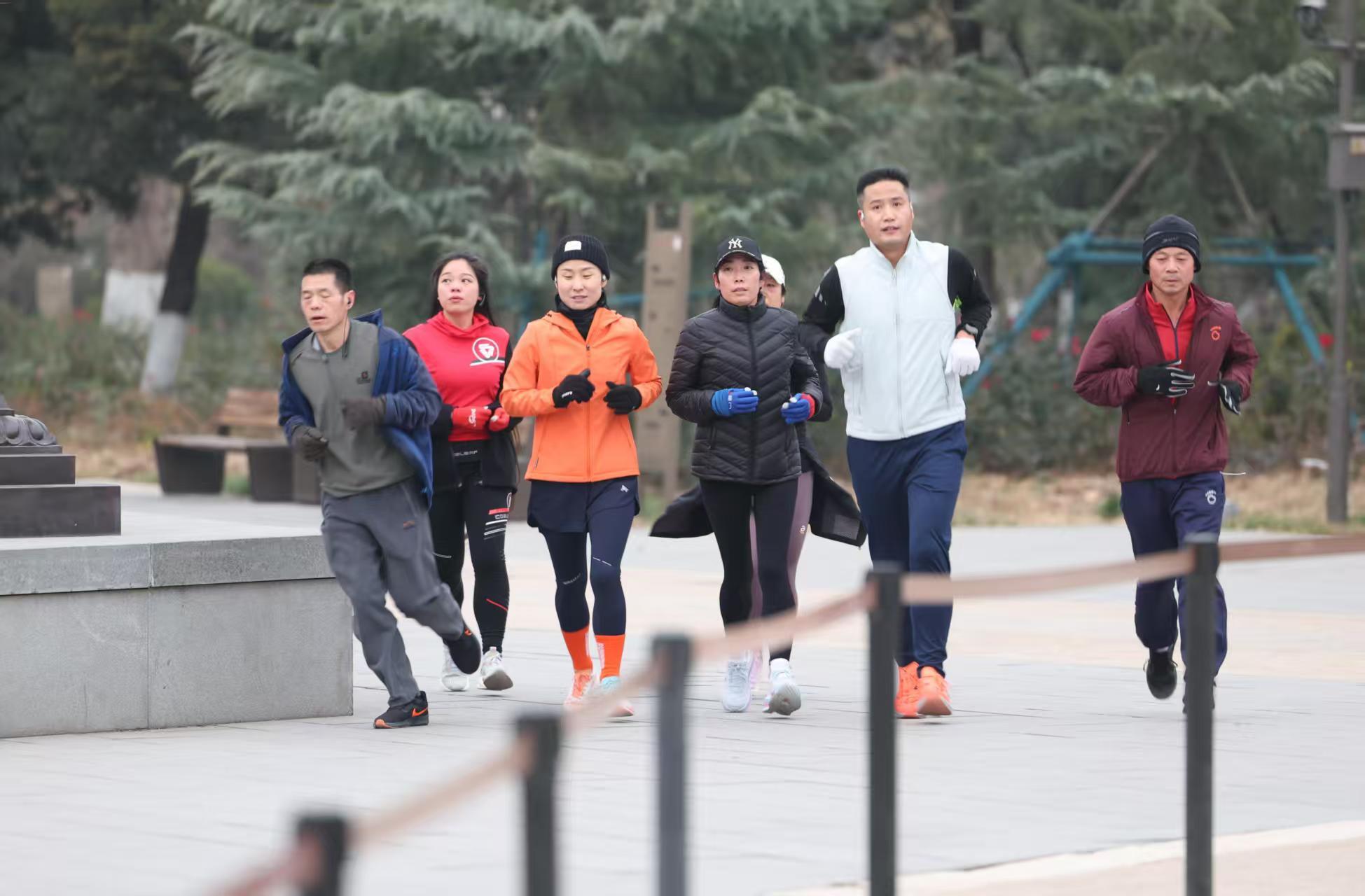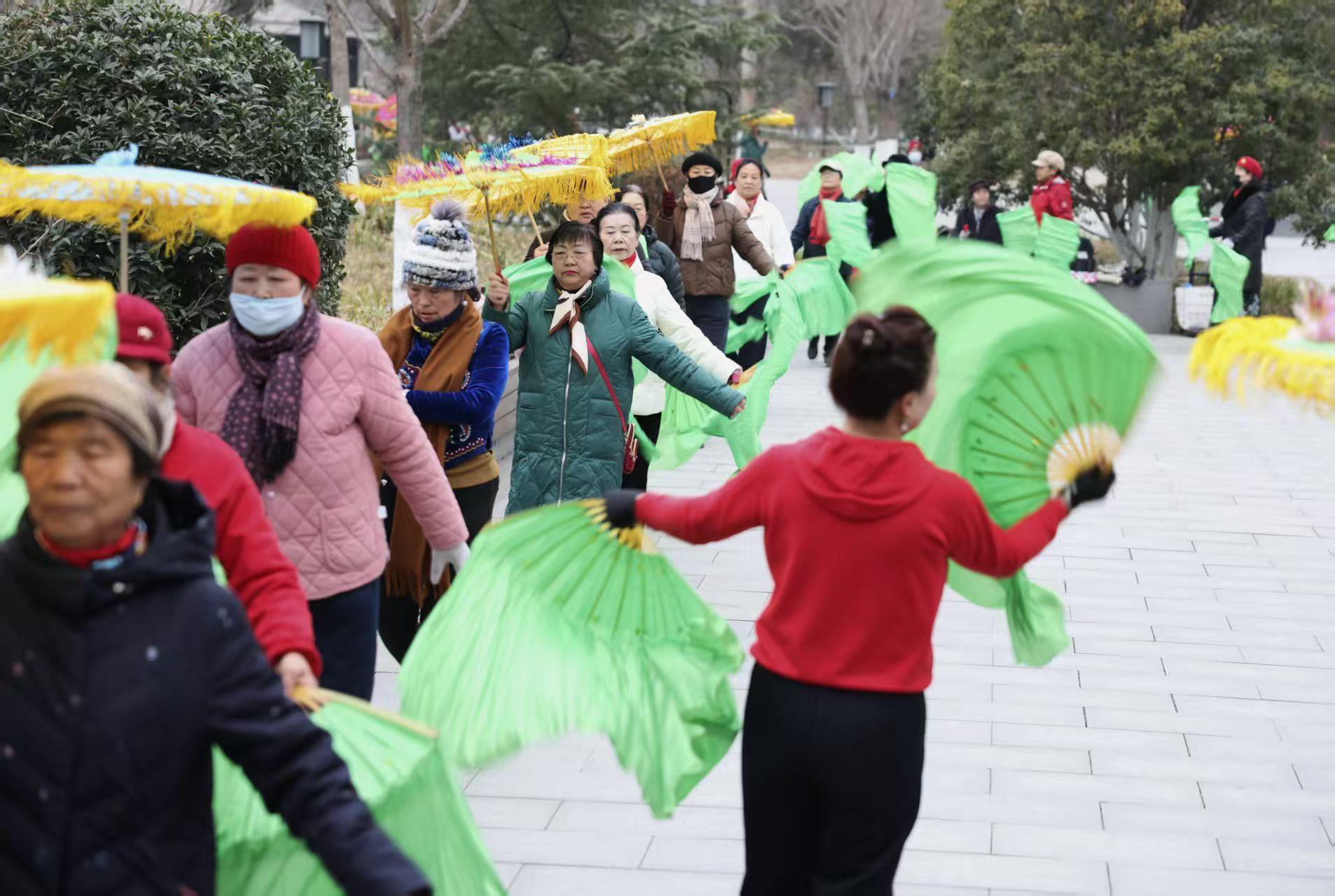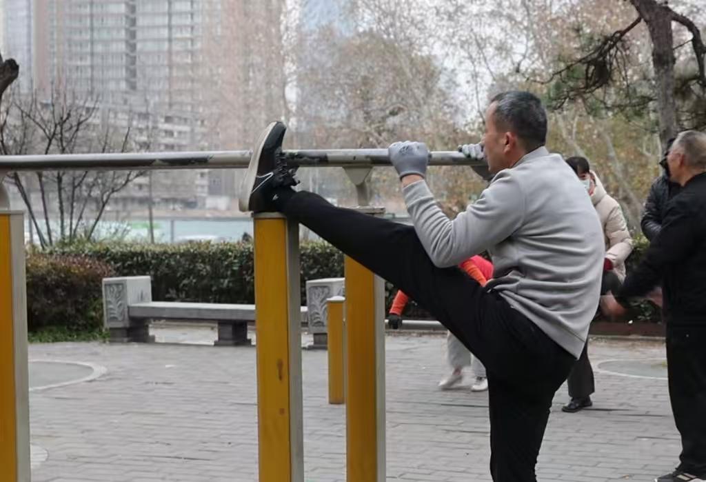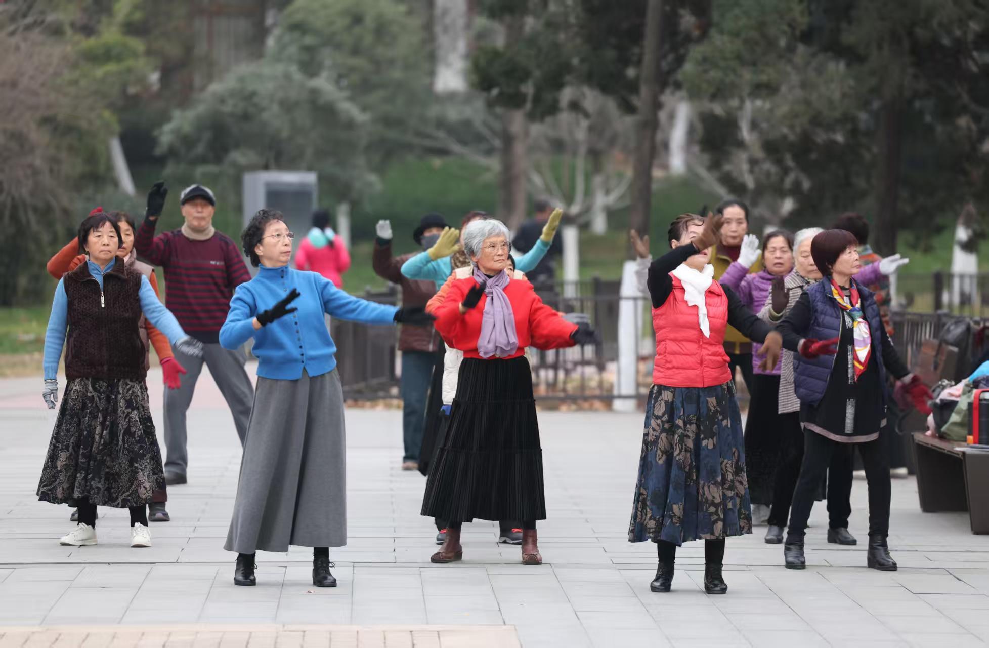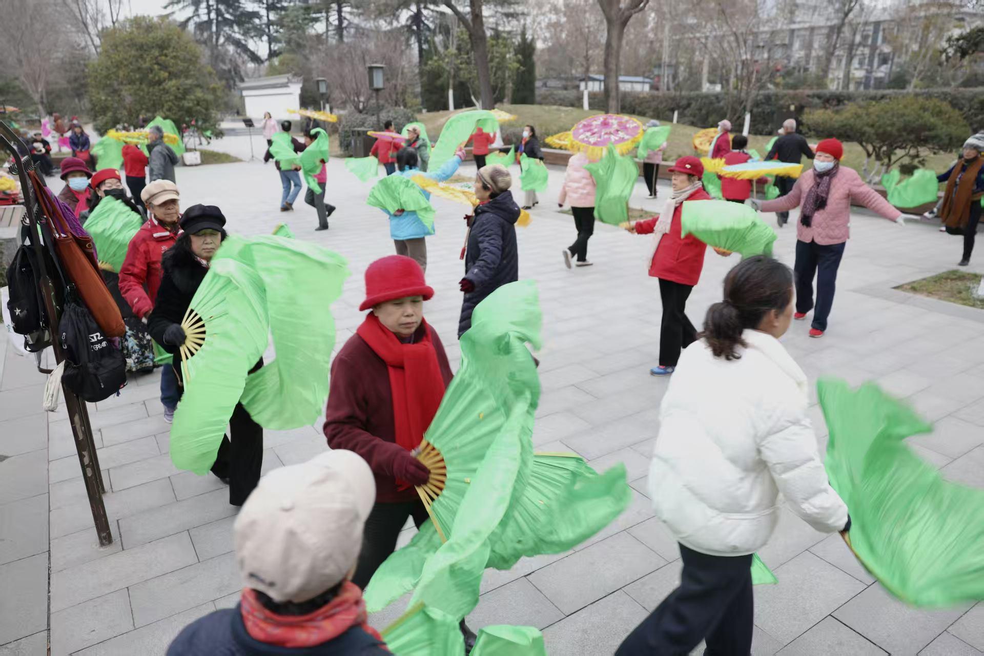 12月22日8时许,西安市兴庆宫公园已经热闹了起来。步道上,慢跑爱好者戴着耳机,踏着旋律开始运动,呼出的白气在冷空气中瞬间消散;一旁的空地上,几位市民手里拿着扇子、花伞,伴着轻快节奏扭动着身体,动作舒展利落、行云流水。