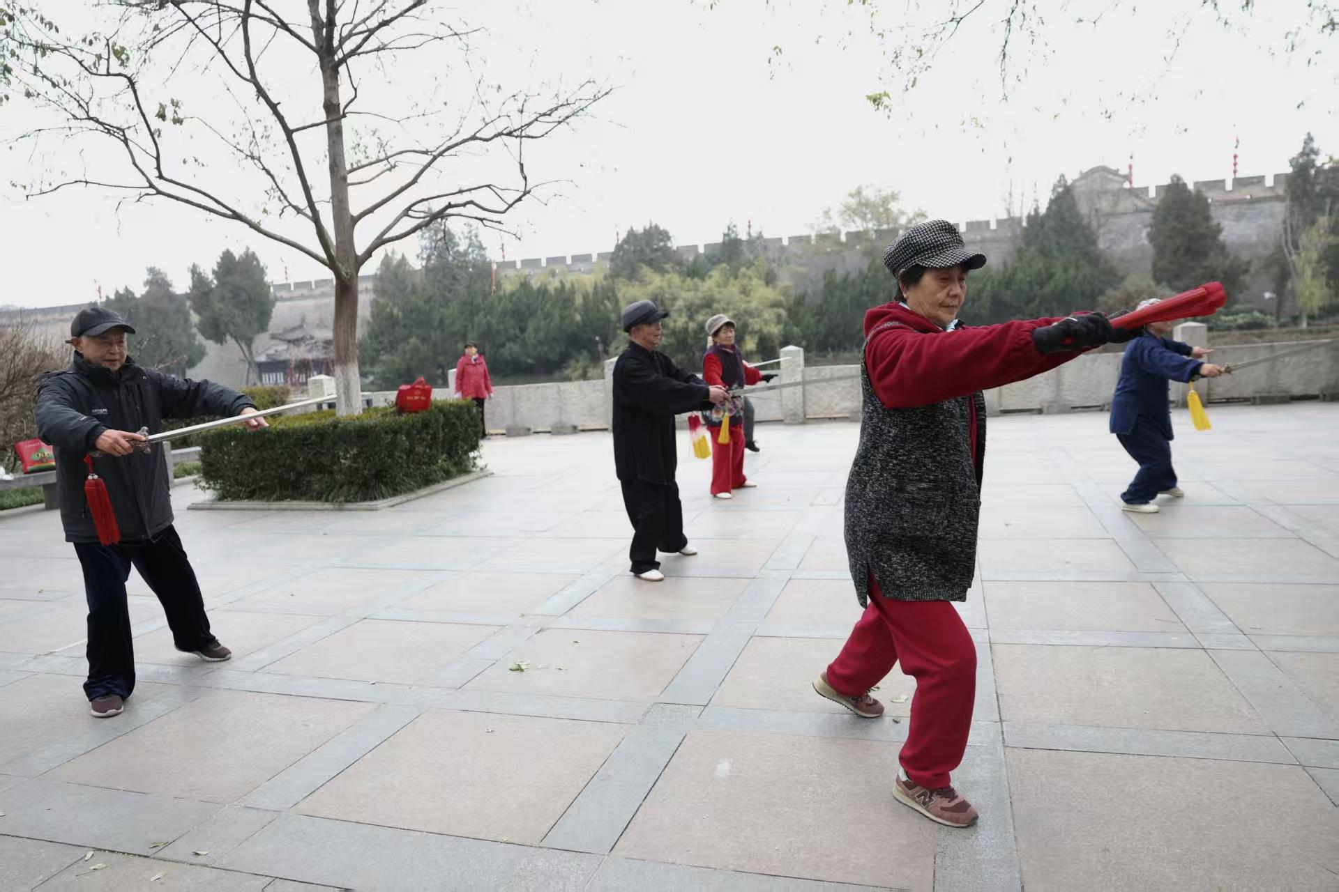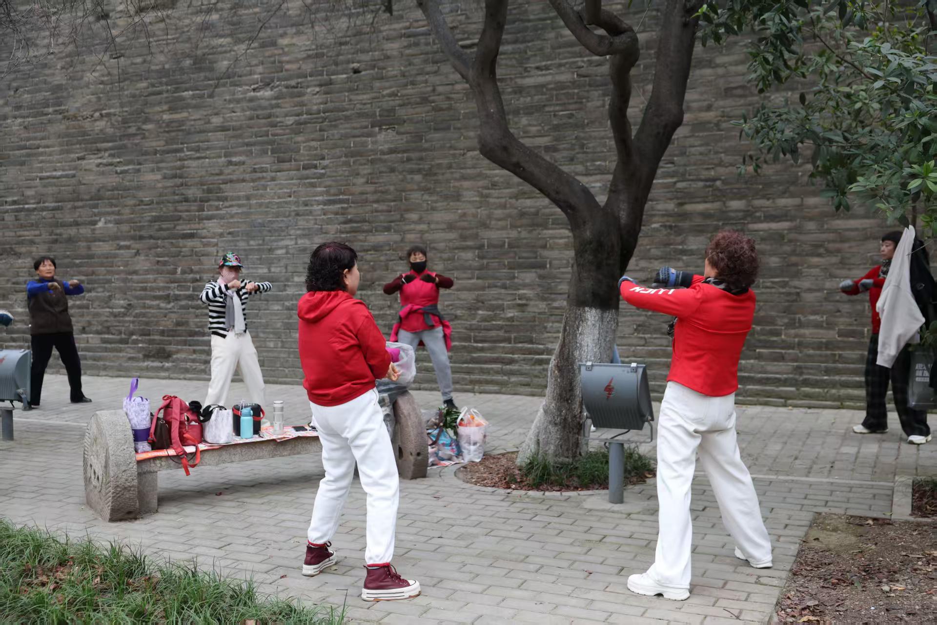 走进环城公园,健身操队伍伴着动感音乐舞动,在城墙下展示着满满元气;器械区内,几位市民在单杠上舒展身体,压腿、拉伸,动作娴熟而有力。空地上,几位太极剑爱好者整齐列队,剑穗随动作划出优美弧线,一招一式刚柔相济。