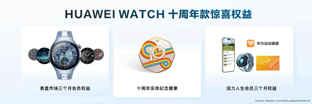 此外,华为为十周年款用户准备了专属礼遇:随表赠送表盘市场会员及华为运动健康活力人生会员3个月权益,回馈广大用户的支持与喜爱。