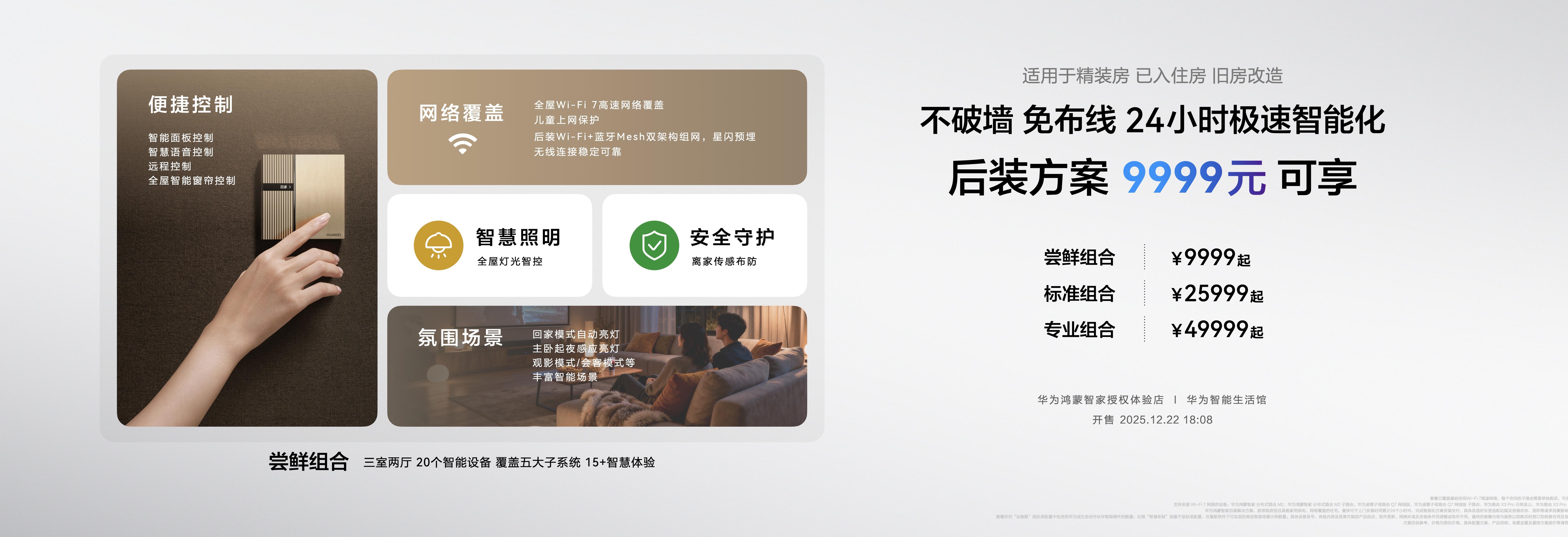 针对广大消费者面对智能家居“选择难、改造难”的问题,华为鸿蒙智家同步推出覆盖“前装”和“后装”场景的多档智装套餐。“前装”方案29999元起,满足空调智能温控、居家安防等基础需求,适配毛坯房和旧房重装;“后装”方案主打“不破墙、免布线”,9999元尝鲜组合涵盖照明、冷暖新风五大子系统,满足精装房及旧房改造需求。用户还可选择厨房安全套装等局部区域改造套装或DIY组合,灵活适配不同场景。