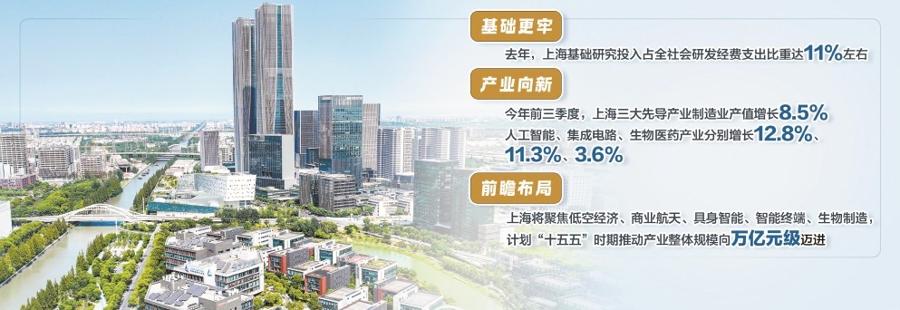 新质生产力正成为上海高质量发展的核心驱动力。今年前三季度,上海三大先导产业增长8.5%,其中人工智能、集成电路、生物医药产业分别增长12.8%、11.3%、3.6%,三大先导制造业产值占全市工业比重达12.3%,较2024年提高0.6个百分点。