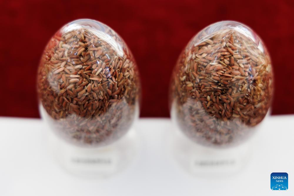 A rapidly domesticated wild rice species is pictured at a press conference of the Chinese Academy of Sciences (CAS) in Beijing, capital of China, Dec. 22, 2025. Chinese scientists have announced a series of major breakthroughs in developing "precision-designed" seeds that can increase crop yields while reducing fertilizer use and enhancing disease resistance, marking a significant advance for food security and sustainable agriculture.