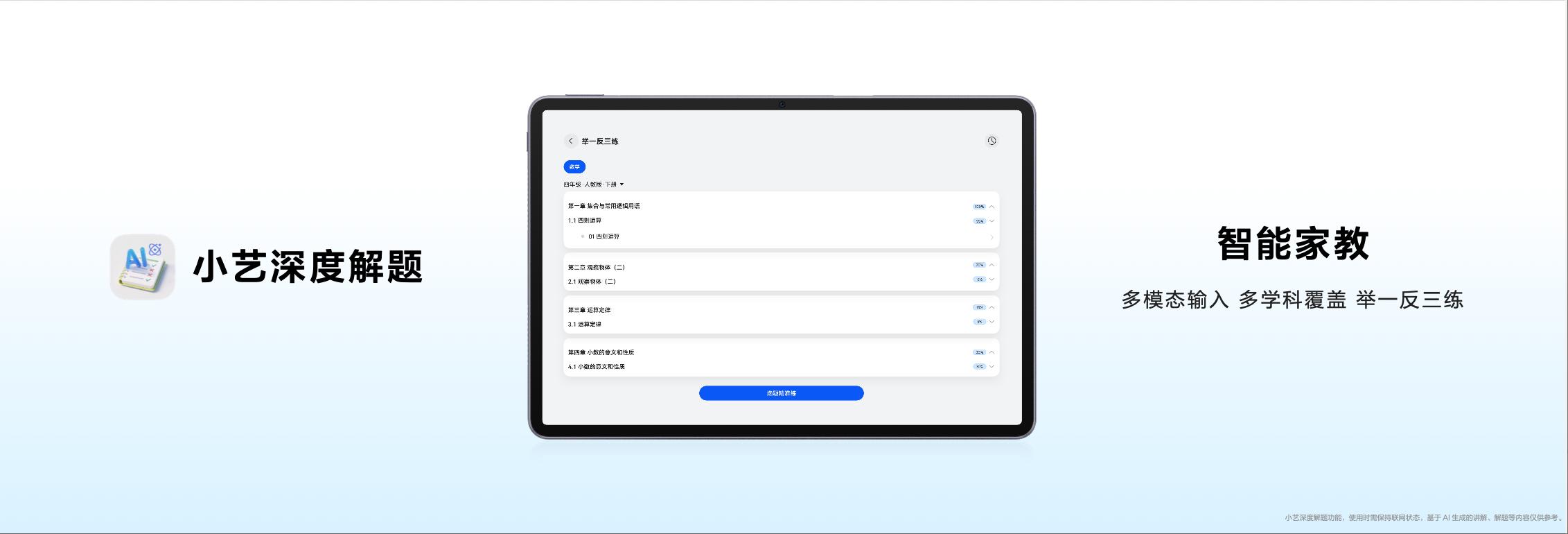 智慧学习方面,华为MatePad 11.5深度融合HarmonyOS,带来全新升级的小艺深度解题功能。该功能可实现作业批改、AI互动讲解,并基于学习过程自动生成错题本,助力系统化的查漏补缺与巩固提升。