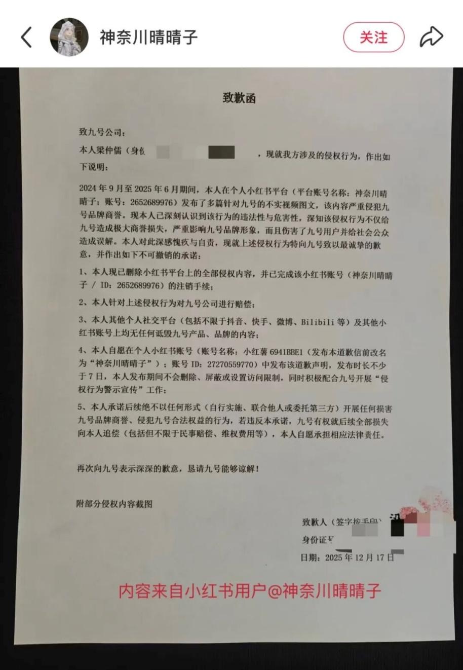 “黑水军”账号“神奈川晴晴子”公开致歉函截图