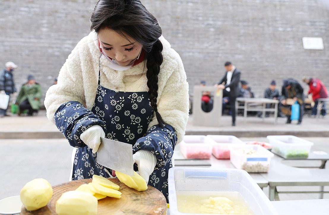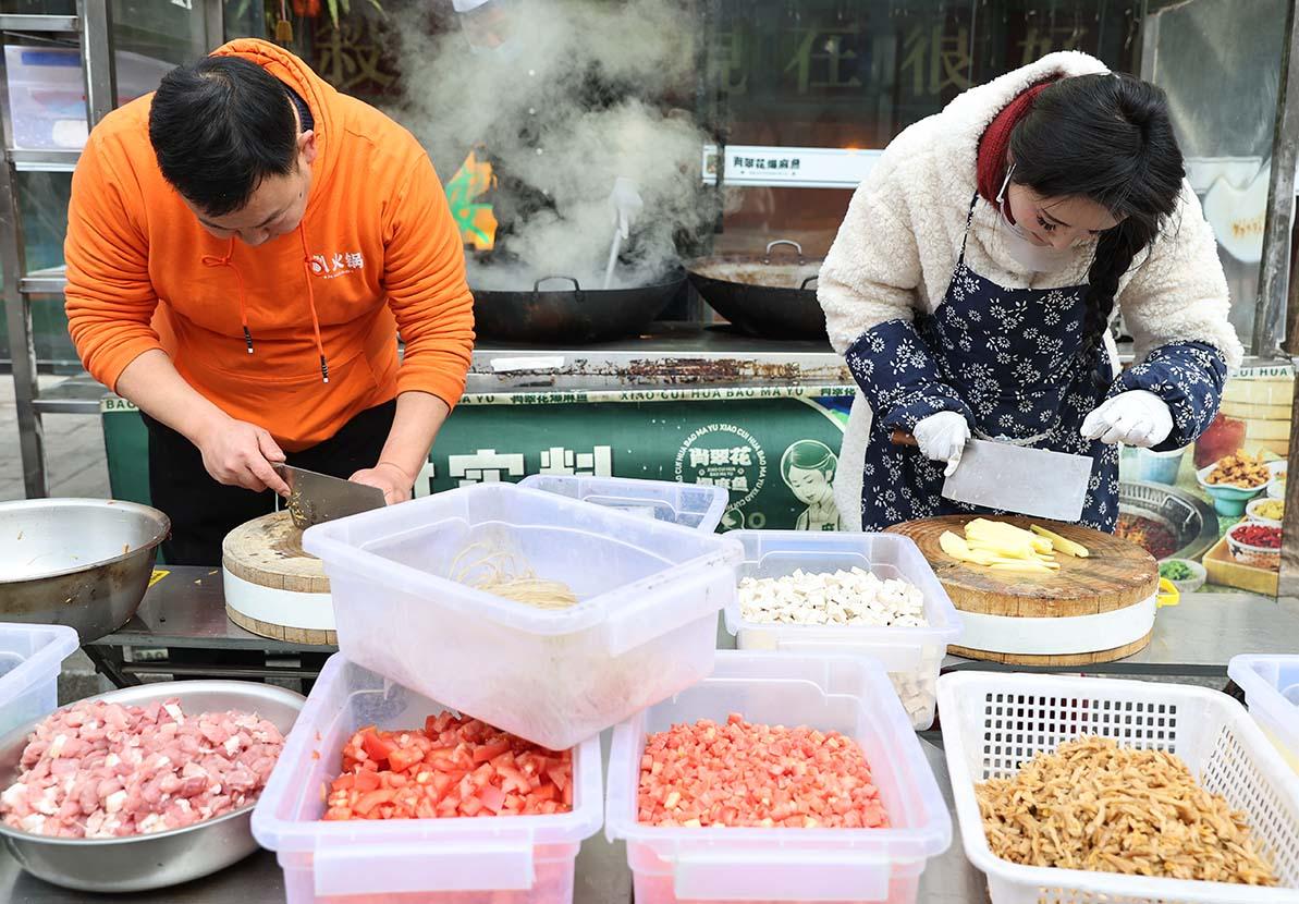 12 月 24 日 11 时,距离开餐还有一小时,小店的厨台早已热火朝天。新鲜的肉块剁得匀称,红萝卜丁、木耳碎、莴笋丁码得整整齐齐,十余种切好的食材在食盒里排开,色彩鲜亮得晃眼。系着蓝布围裙的店主张婷,正和店员们清点备货:“肉 10 斤、笋 5 斤,还有午餐肉和鸡蛋,得备足三大锅,怕来的人多不够吃。”