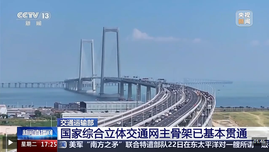 “6轴7廊8通道”国家综合立体交通网主骨架已经基本贯通,连接了全国超过80%的县级行政区,服务全国90%左右的经济和人口总量,交通固定资产投资达到18.8万亿元,交通运输综合能力、运行效率大幅提升。这期间,深中通道、京哈高速辽宁段改扩建、北京东六环改造、常泰长江大桥、青岛港董家口港区、福州港江阴港区等一大批标志性的重大工程全面建成。