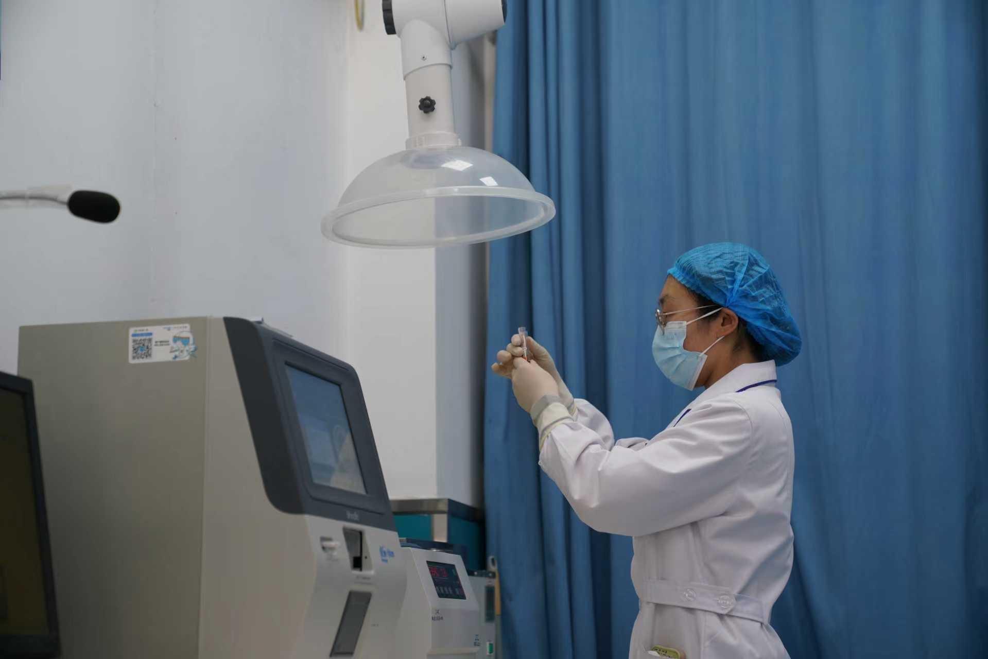 在临潼区骊山卫生院检验科,检验师正操作血液细胞分析仪为患者房女士的血液样本做检测。