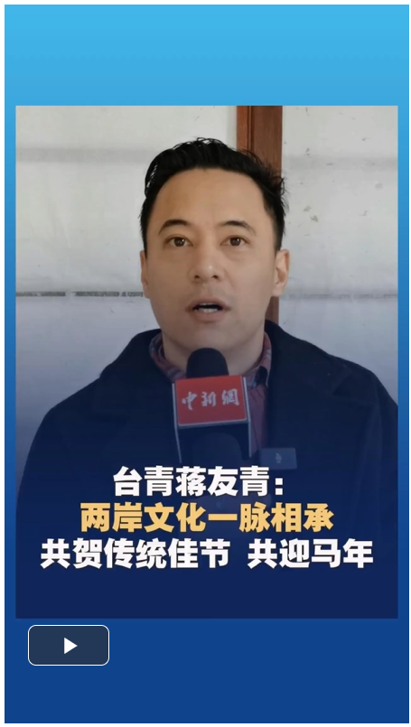 台湾青年蒋友青日前与中新社畅谈两岸文化与在大陆生活体验时表示,两岸是同一个文化,两岸同胞都会庆祝元宵节和春节,明年两岸同迎马年。蒋友青坦言,在社交平台分享两岸共通的文化,具有新鲜感。在台湾期间,有不少人在抖音、小红书等社交平台关注他,让他倍感惊喜。