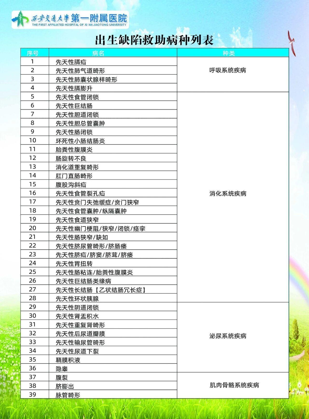 作为项目定点执行医院,将为符合条件的患儿提供以下支持:救助对象 1.18周岁(含)以下; 2.中国籍; 3.家庭经济困难; 4.确诊为出生缺陷(详见下表)且具有手术指征。