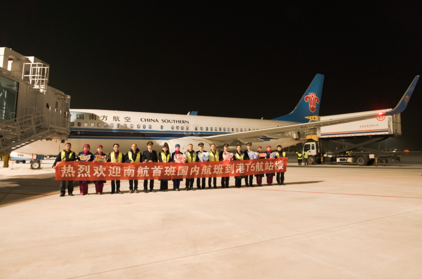 当晚,在首个进港航班抵达后,南航地服人员手持印有“明珠耀长安 丝路启华章”“南航入驻T5”“飞阅山河 起落长安”等字样的特色欢迎牌,以热情的笑容迎接首批抵达新航站楼的“木棉”旅客,与旅客共同见证这一意义非凡的瞬间。下客完毕后,南航在停机坪举行了简短的接机仪式,记录南航在西安发展的重要时刻。