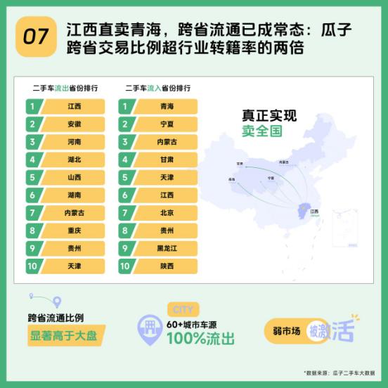 瓜子二手车平台数据显示,江西省成为二手车流出最多的省份,近九成车源销往省外;而细化到城市维度,平台上有超过60个城市的二手车供给100%流出,在区域外达成交易。而青海、宁夏、甘肃、内蒙古等,则成为重要的车源流入地。长期以来,这些地区因物理条件的限制导致线下市场薄弱,消费者选择受限,而线上平台的出现,正在打破这一结构性限制,让二手车真正普惠到每一个消费者。