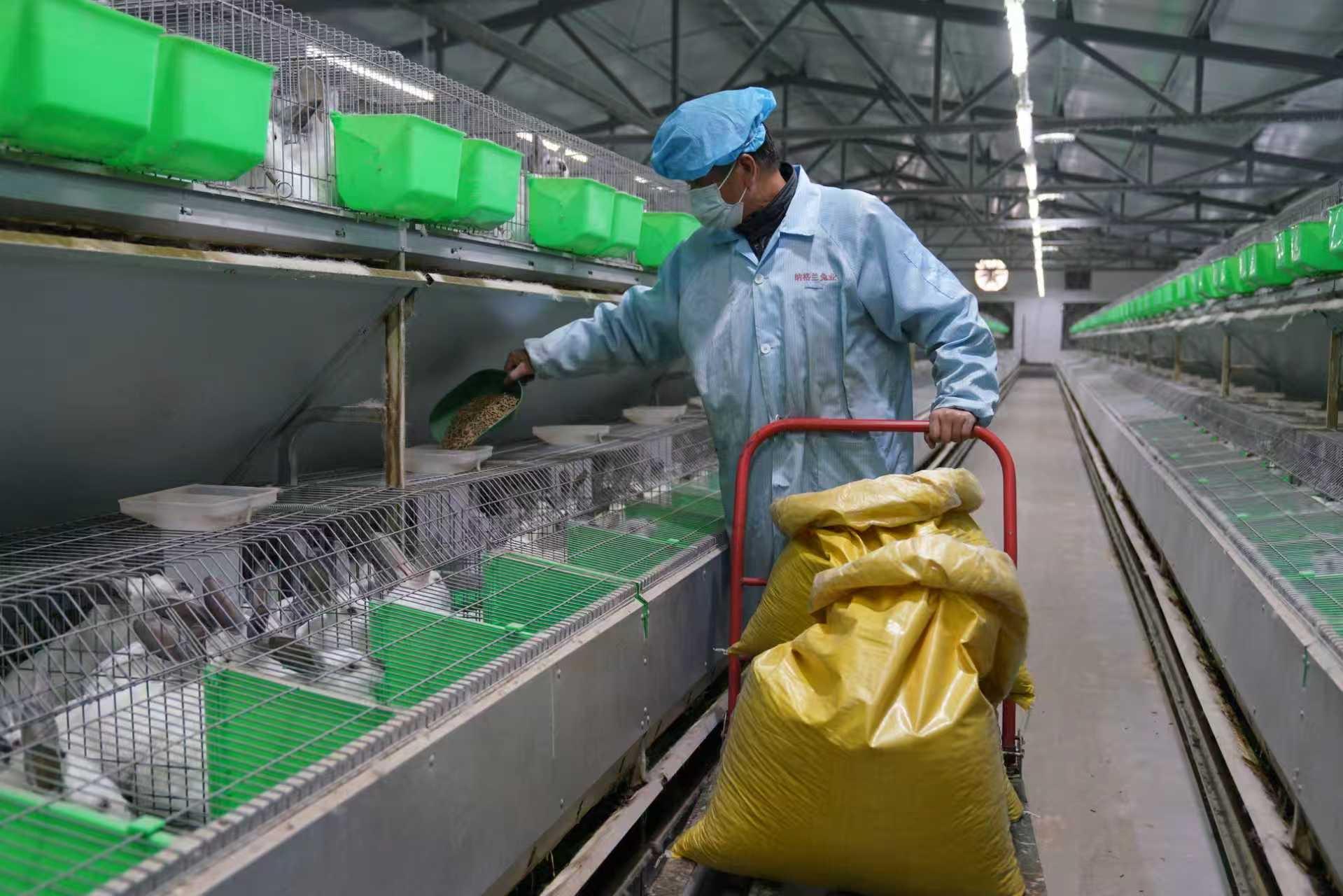 “我在这儿干了一年多了,主要负责6号兔舍卫生打扫、消毒、兔子饲喂等工作。每个月有4000多元的收入,离家近,还能顾上家里。”师龙一边忙着手里的活一边说。