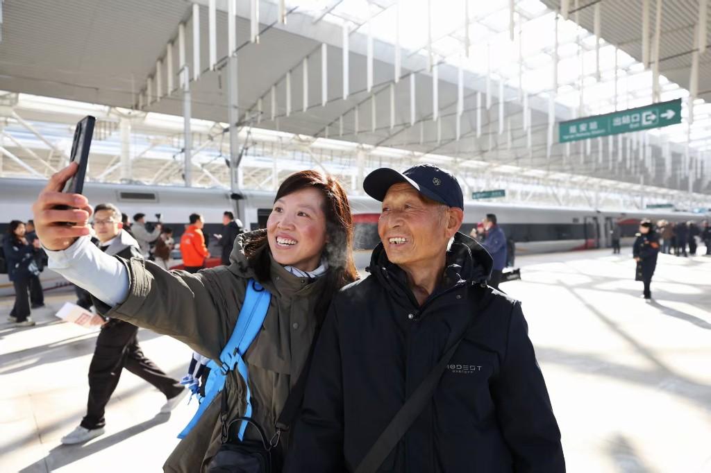 如今,这样的奔波已成过往。首发当日,父女俩乘坐在2号车厢,列车平稳飞驰,窗外风景飞速掠过,原本漫长的旅途被浓缩成舒适的短途出行。“他一路都在惊叹,一会儿扒着窗户看风景,一会儿拿出手机拍照,嘴里不停说‘真先进’。”陈娟说,为了留住这份仪式感,她在西安北站出发前就给父亲拍了打卡照,列车上的陕北特色宣传册、热闹的互动节目,都被她一一记录在朋友圈。