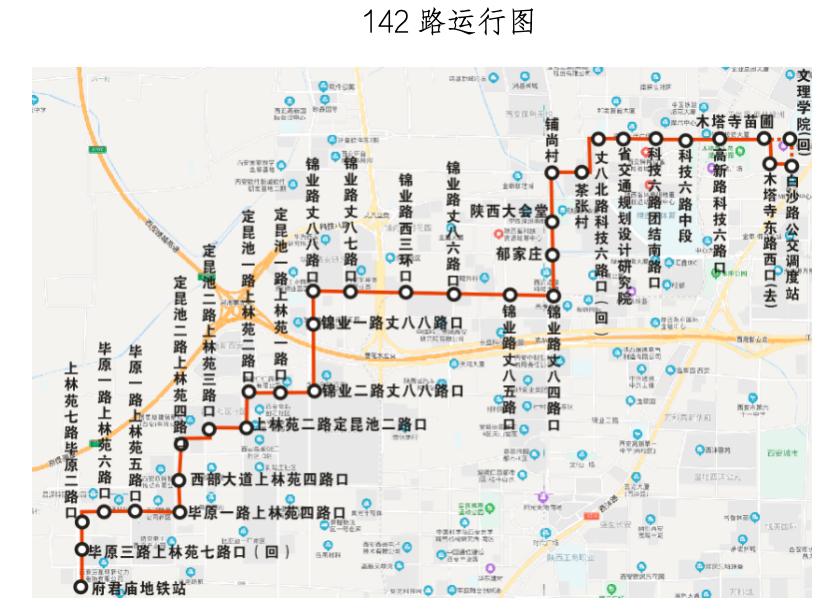去程由白沙路公交调度站发车,经木塔寺东路、木塔寺路、科技六路、丈八北路、科技七路、鱼化一路、丈八四路、锦业路、丈八八路、定昆池一路、上林苑二路、定昆池二路、上林苑三路、定昆池二路西段、上林苑四路、毕原一路、上林苑七路至府君庙地铁站;回程由府君庙地铁站发车,经上林苑七路、毕原一路、上林苑四路、定昆池二路西段、上林苑三路、定昆池二路、上林苑二路、定昆池一路、丈八八路、锦业路、丈八四路、鱼化一路、科技七路、丈八北路、科技六路、白沙路、木塔寺东路至白沙路公交调度站。线路长度17公里。首班6:30末班19:30,实行无人售票两元一票制,可刷卡。