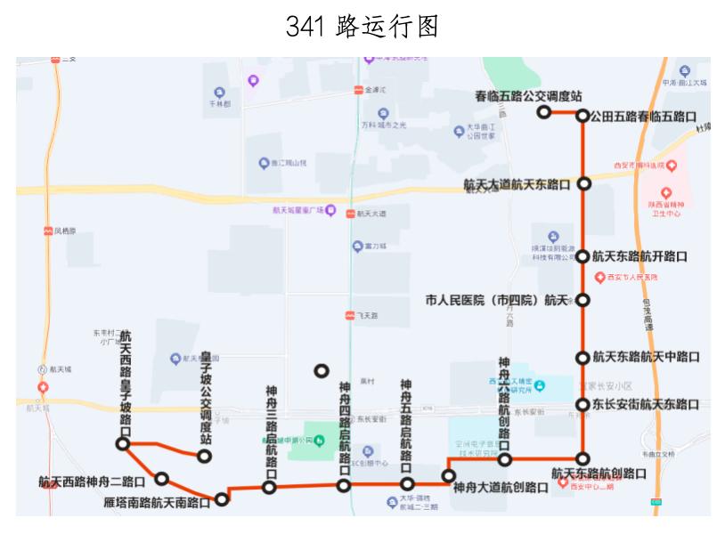 线路设置站点17个:皇子坡公交调度站、航天西路皇子坡路口、航天西路神舟二路口、雁塔南路航天南路口、神舟三路启航路口、神舟四路启航路口、神舟五路启航路口、神舟大道航创路口、神舟六路航创路口、航天东路航创路口、东长安街航天东路口、航天东路航天中路口、市人民医院(市四院)航天院区、航天东路航开路口、航天大道航天东路口、公田五路春临五路口、春临五路公交调度站。
