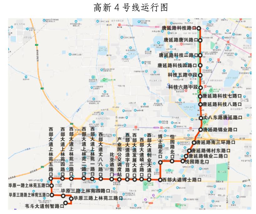 线路设置站点34个:韦斗大道创智路口、毕原三路上林苑三路口、毕原三路上林苑四路口、毕原三路上林苑五路口、毕原一路上林苑五路口、西部大道上林苑五路口、西部大道上林苑四路口、西部大道上林苑三路口、西部大道上林苑二路口、西部大道上林苑一路口、西部大道丈八八路口、比亚迪南门、产业园公交调度站、西部大道造字台路口、西部大道发展大道口、西部大道硕士路口、西部大道创业大道口、西部大道博士路口、博士路北口、怡园路北口、悦园路北口、唐延路锦业二路口、唐延路傅村东路口、唐延路南三环路口、唐延路锦业路口、丈八东路唐延路口、唐延路科技八路口、唐延路科技七路口、科技六路中段、科技五路中段、唐延路科技四路口、唐延路科技二路口、唐延路唐兴路口、唐延路科技路口。