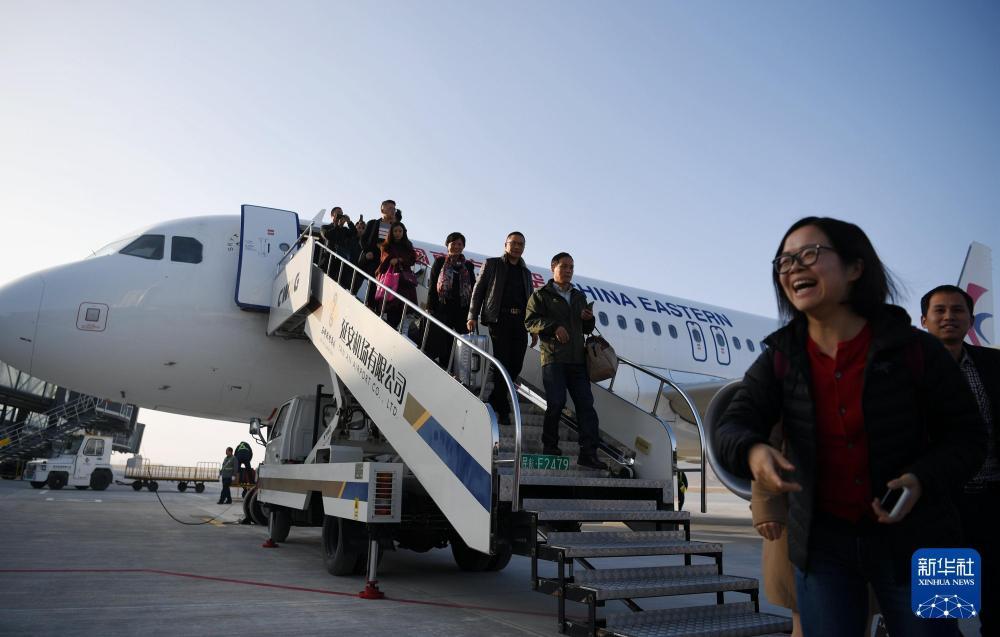 2018年11月8日,首班抵达南泥湾机场的乘客走下飞机。新华社记者 张博文 摄如今