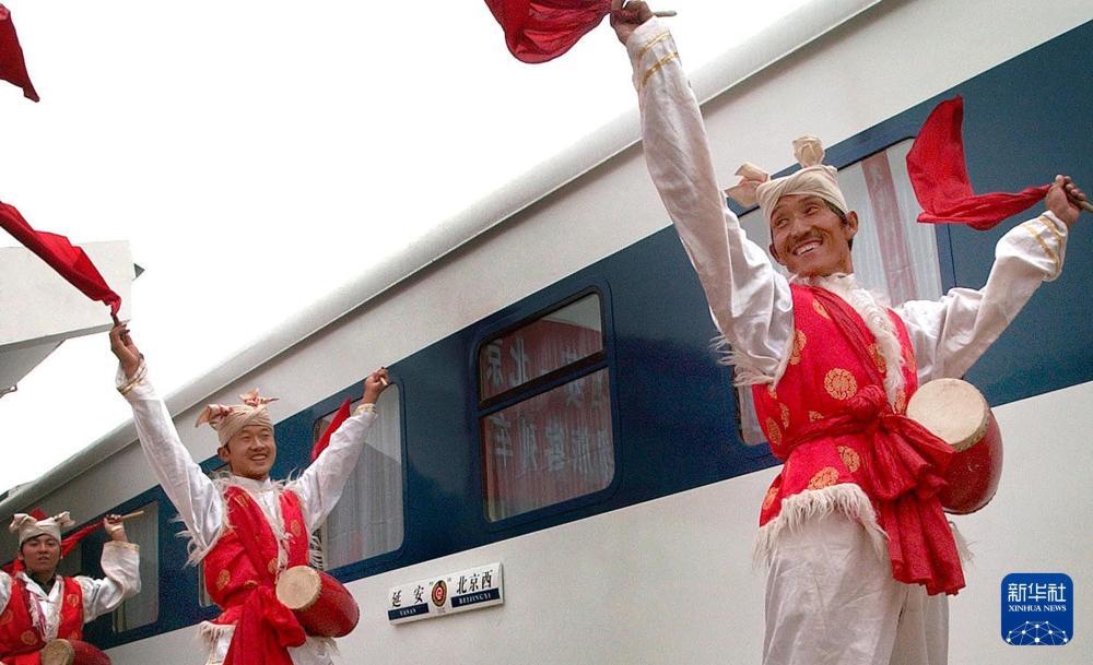 2005年7月1日,延安人以安塞腰鼓庆祝延安至北京西的T45次特快列车首发。T45/46是陕北革命老区第一对直通北京的特快旅客列车,行程16小时38分。新华社记者 丁海涛 摄