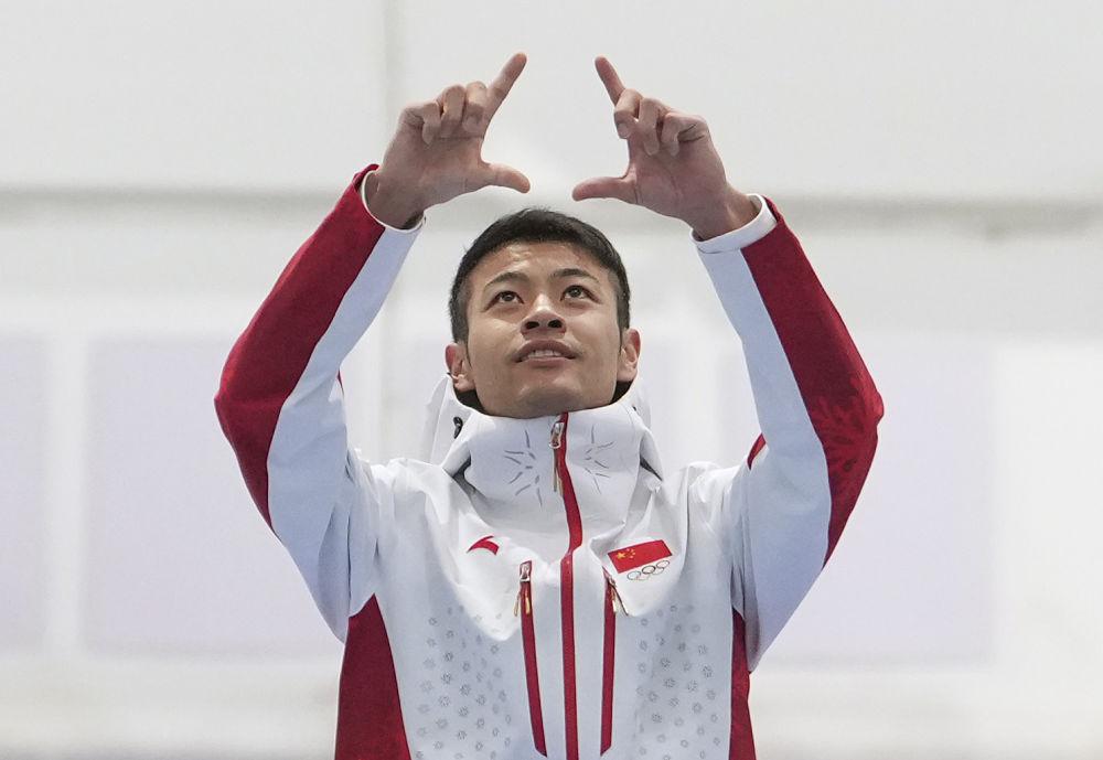 ↑2月8日,中国选手高亭宇在第九届亚冬会速度滑冰男子100米决赛后庆祝夺冠。新华社记者 李一博 摄