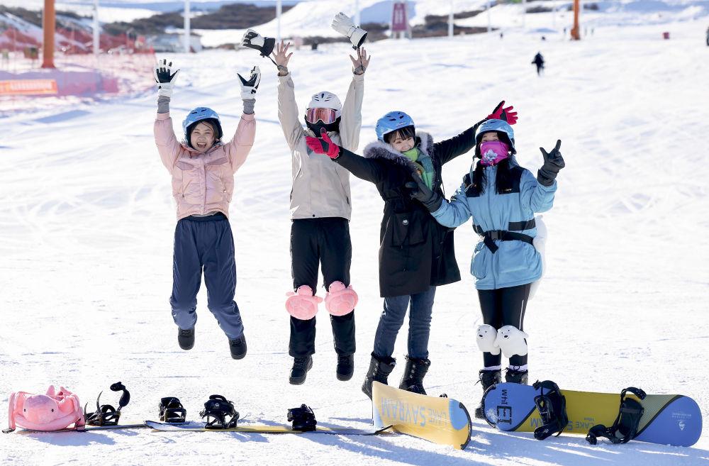 ↑这是2025年1月27日拍摄的几名滑雪爱好者在新疆丝绸之路山地度假区合影留念。新华社记者王菲摄